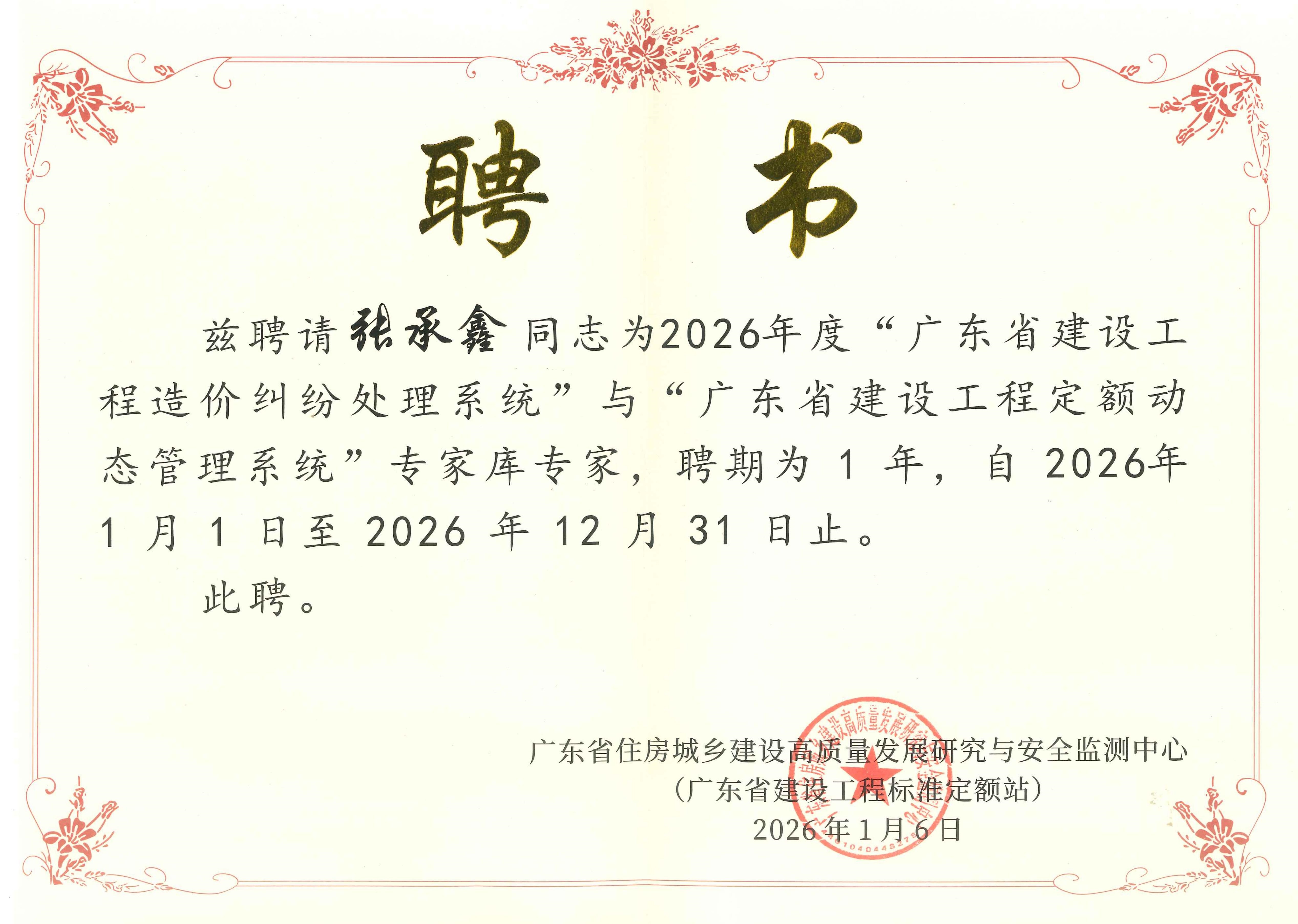 近期,广东省住房城乡建设高质量发展研究与安全监测中心(广东省建设工程标准定额站)发布了建设工程造价纠纷处理与定额动态管理双系统2026年度专家名单,新誉时代资深造价专家张承鑫再度入选广东省双系统专家库!