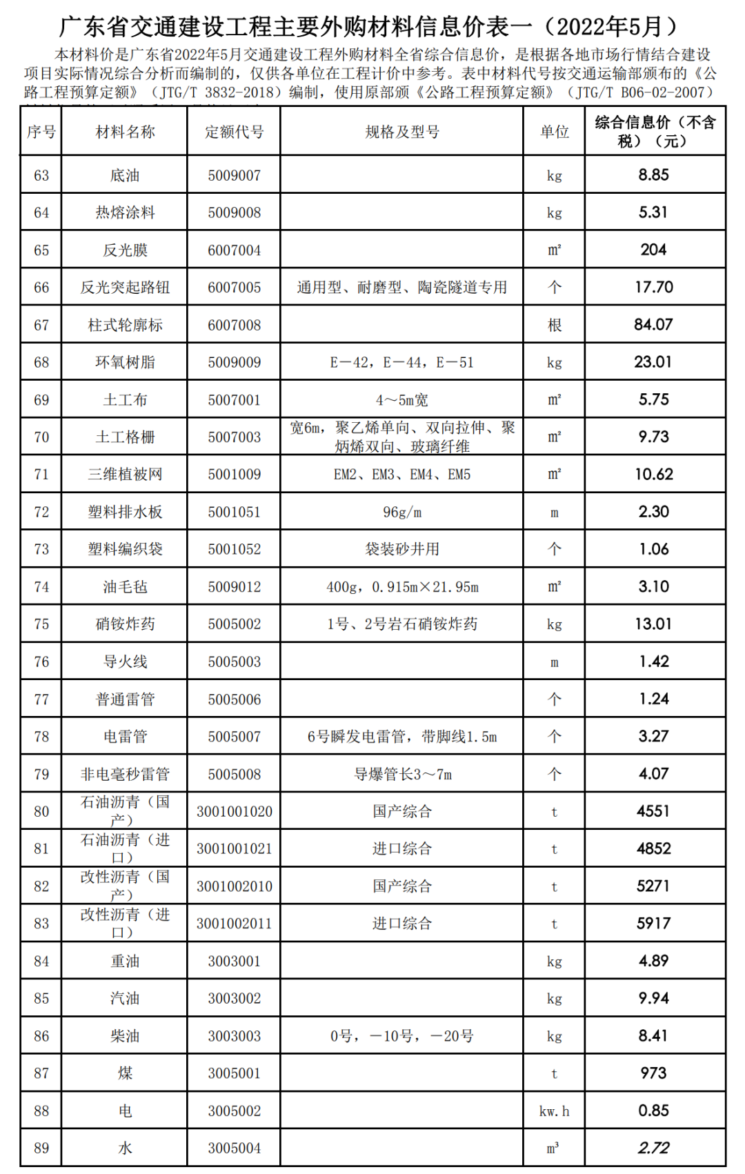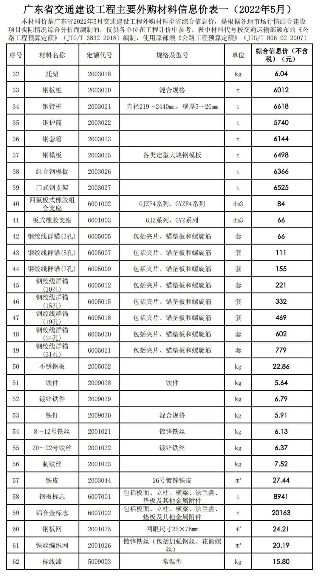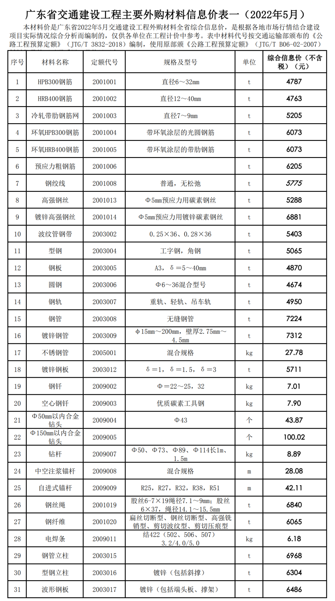 2022年6月,广东交通造价发布2022年5月交通建设工程外购材料全省综合信息价,本材料价是广东省2022年5月交通建设工程外购材料全省综合信息价,是根据各地市场行情结合建设项目实际情况综合分析而编制的,仅供各单位在工程计价中参考。表中材料代号按交通运输部颁布的《公路工程预算定额》(JTG/T 3832-2018)编制,使用原部颁《公路工程预算定额》(JTG/T B06-02-2007)材料代号的可对照采用。具体见下表。
