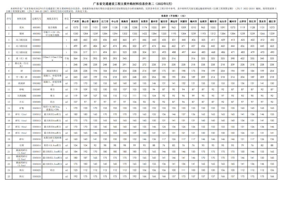 广东省发布2022年5月交通建设工程外购材料全省综合信息价
